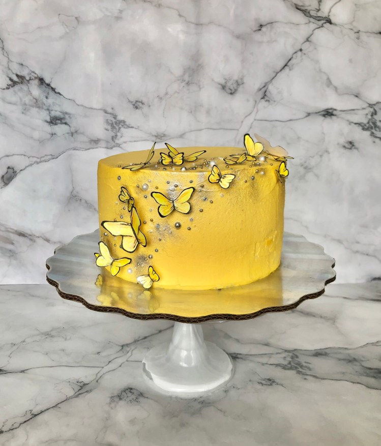 Pastel de limón de dos pisos decorado con chantilly tipo fantasía.