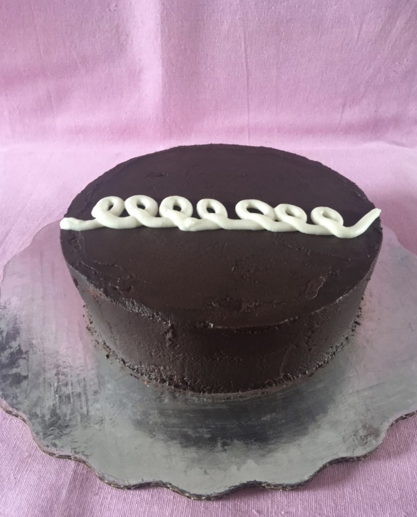 Pastel de chocolate relleno de crema dulce decorado con ganache de chocolate