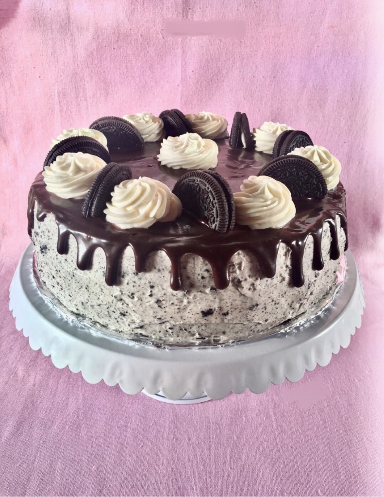 Pastel de chocolate cubierto betún de queso crema con oreo decorado con una capa de ganache de chocolate y galleta oreo