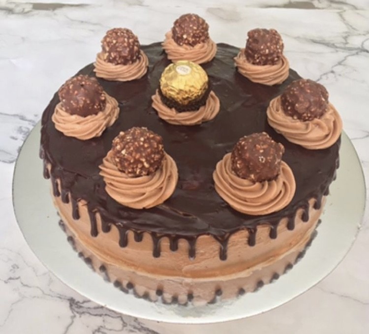 Pastel de chocolate relleno de ferrero roches y cubierto de ganache de chocolate decorado con ferreros
