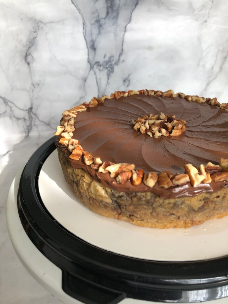 Panque marmoleado de Nutella y vainilla decorado con más Nutella y nuez