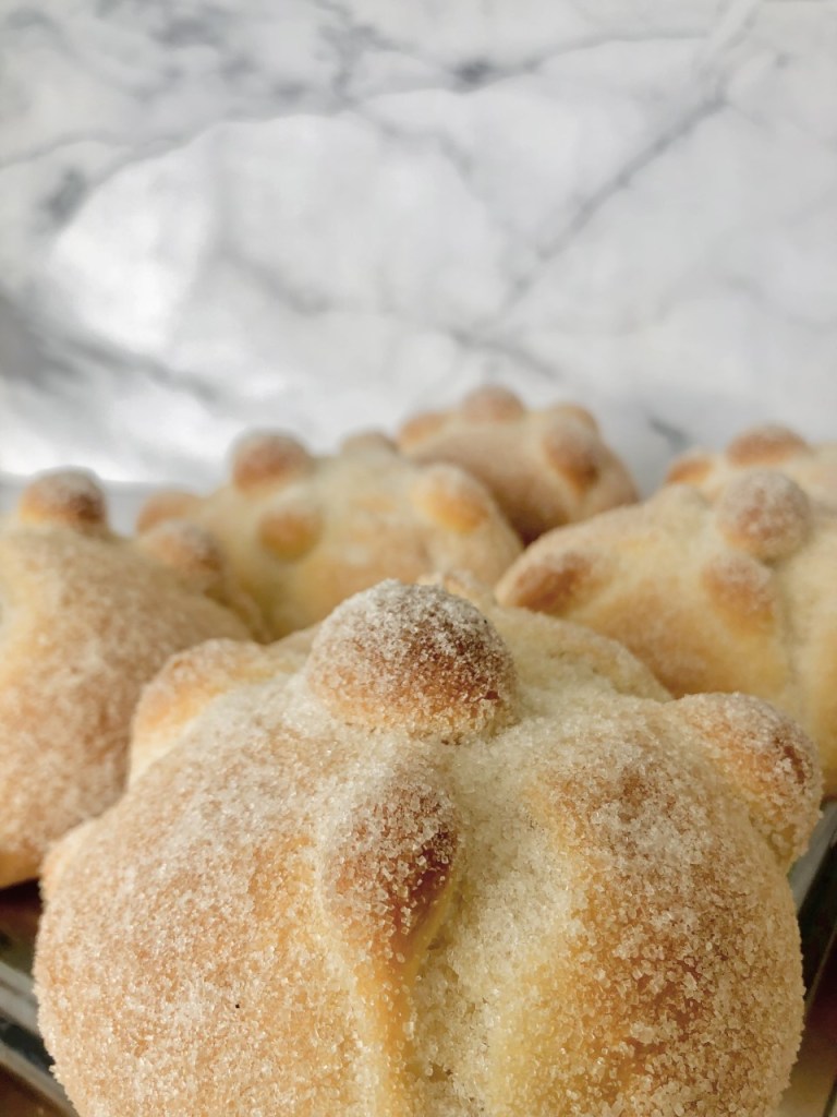 Esponjoso y rico pan de muerto con un toque de azahar y naranja cubierto de azúcar, con ingredientes frescos